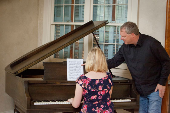 Drew teaches piano lessons on his Yamaha Baby Grand at his home studio. His energy and passion for music are infectious and this is evident during every lesson he teaches.